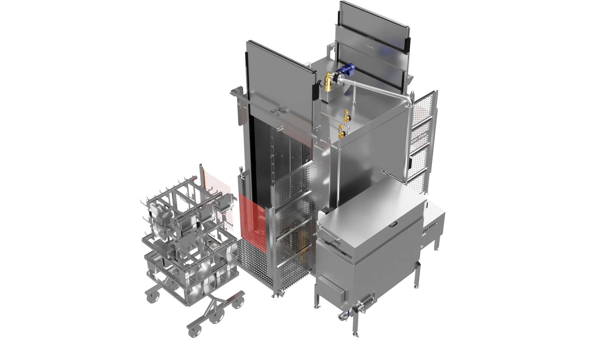Das rezirkulierende Waschsystem mit automatischer Wassererwärmung und Reinigungsmittelzufuhr reinigt die Gestelle gründlich und entfernt Bakterien. Nach dem Waschprozess werden die Gestelle nachgespült, um sicherzustellen, dass sie pH-neutral sind.